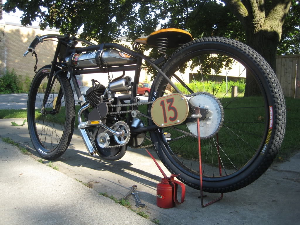 I've not seen many examples of board track racer replicas in general, and the ones I have seen have a fundamental problem in my opinion--the frames don't dip down for the oil tanks (like the originals), and even if they do, many times the engines look too small in the frame, and there's simply too much open area...